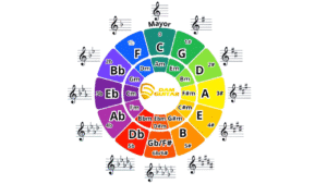 ¿Por qué se llama Círculo de «Quintas»? Porque cada nota en el círculo está separada por una quinta perfecta de la siguiente. Una quinta perfecta es un intervalo que suena súper estable y consonante – es el secreto detrás de los famosos «power chords» de la guitarra.